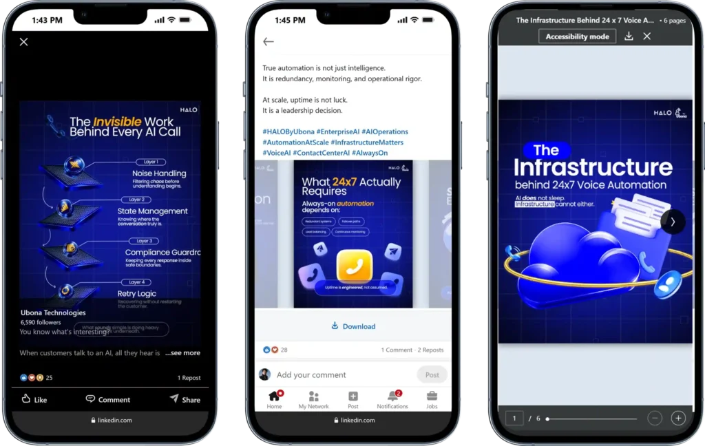 We took on the full LinkedIn retainer, handling strategy, creative production, and publishing across all content formats. Every piece of content was designed around a specific product-audience pairing: call automation for contact center heads at BFSI firms, analytics and insight tools for operations and CX leaders at ecommerce platforms, cloud connectivity for IT and infrastructure buyers at government and large enterprise accounts.